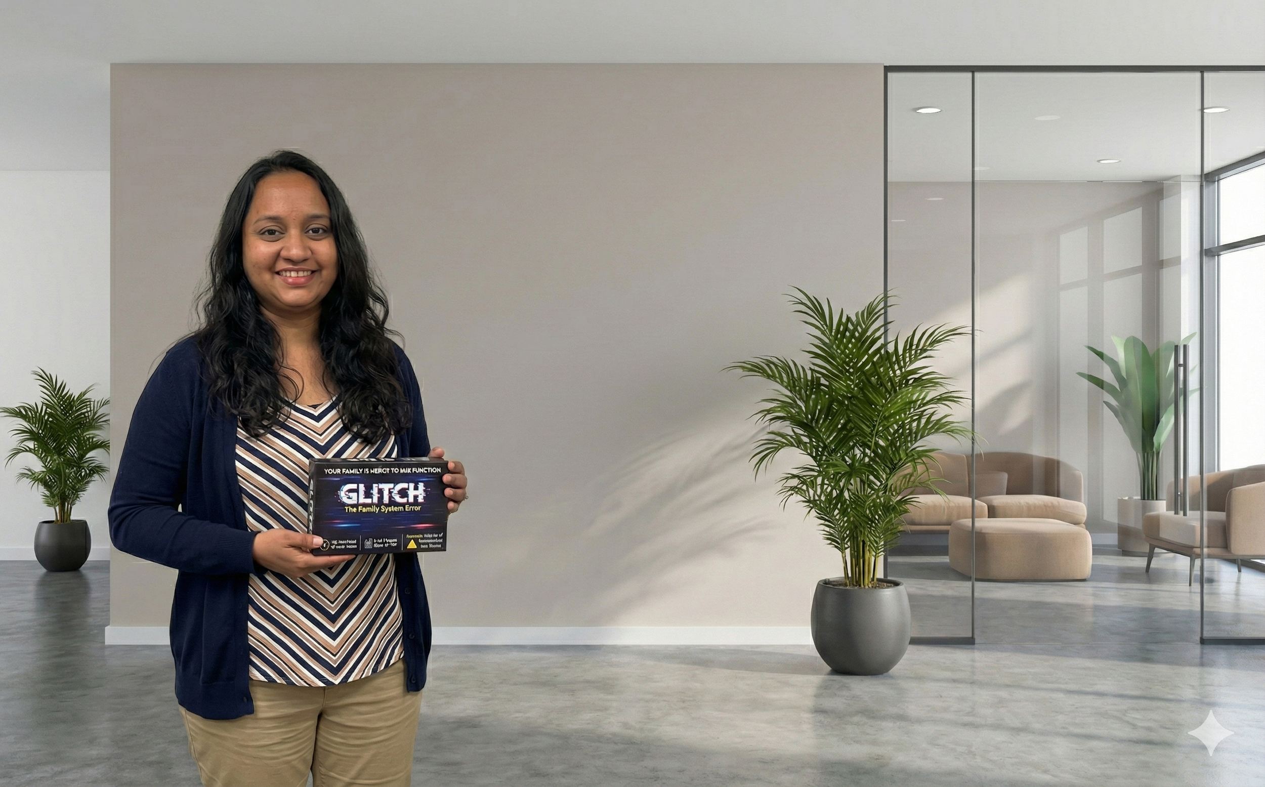 "I’m Anisha Karkhanis—mom, crafter, and entrepreneur. I built GLITCH to capture the beautiful, unpredictable chaos of a family game night."